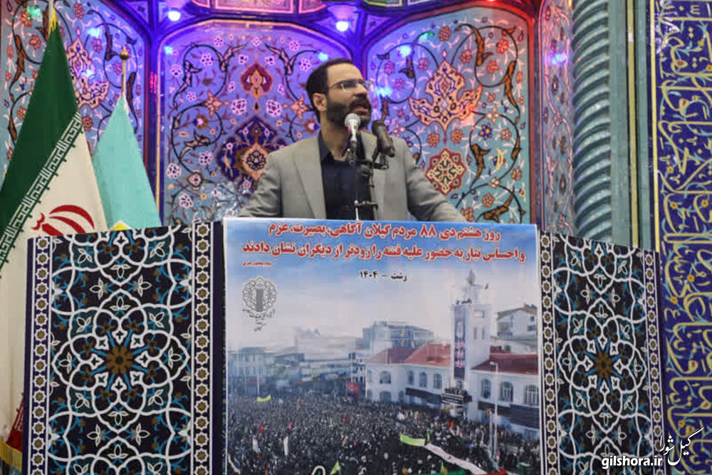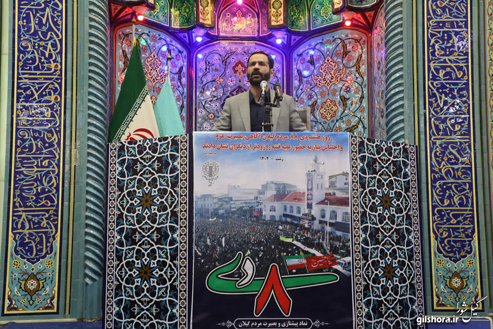 وی با اشاره به خلق حماسه ۹ دی توسط مردم ایران و حماسه ۸ دی توسط گیلانی ها، افزود: بیش از ۱۰۰ سال پیش که روس ها و انگلیسی ها در کشور ما بودند، مردم گیلان به رهبری میرزا کوچک جنگلی در مقابل دشمنان ایستادند و با استعمار مبارزه کردند. گیلانی ها در همه تحولات معاصر ایران نقش داشتند و شهدای گیلان در دوران دفاع مقدس و دفاع از حرم نیز قابل توجه است.